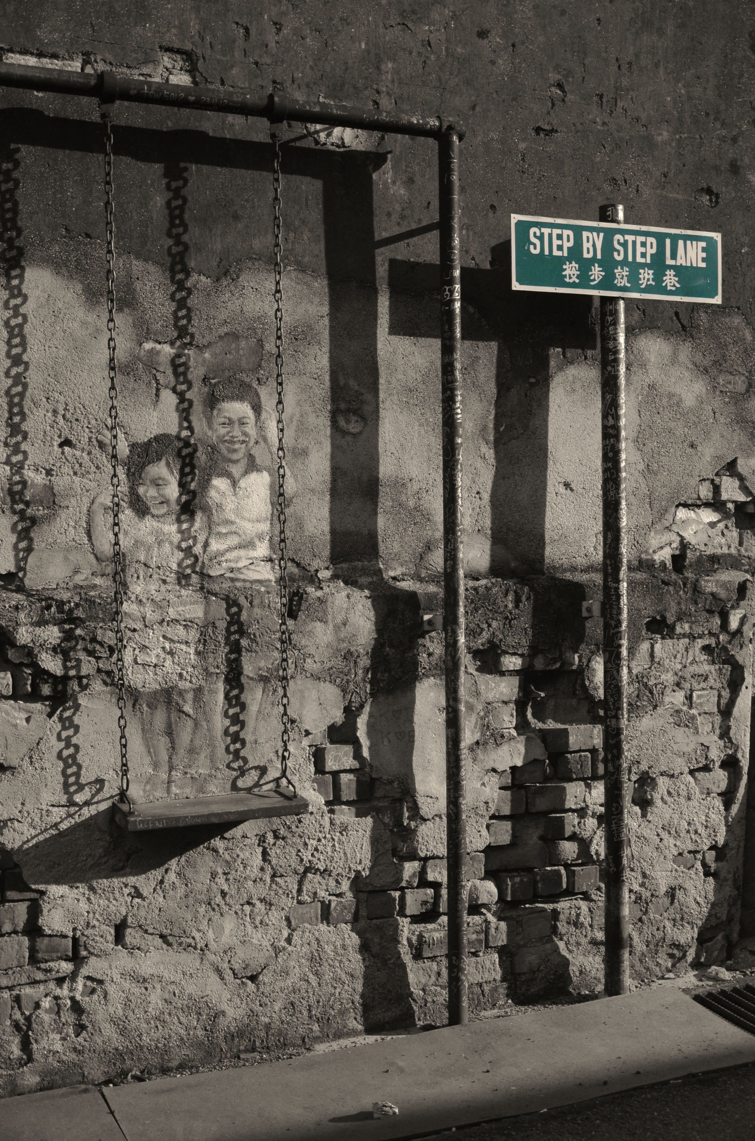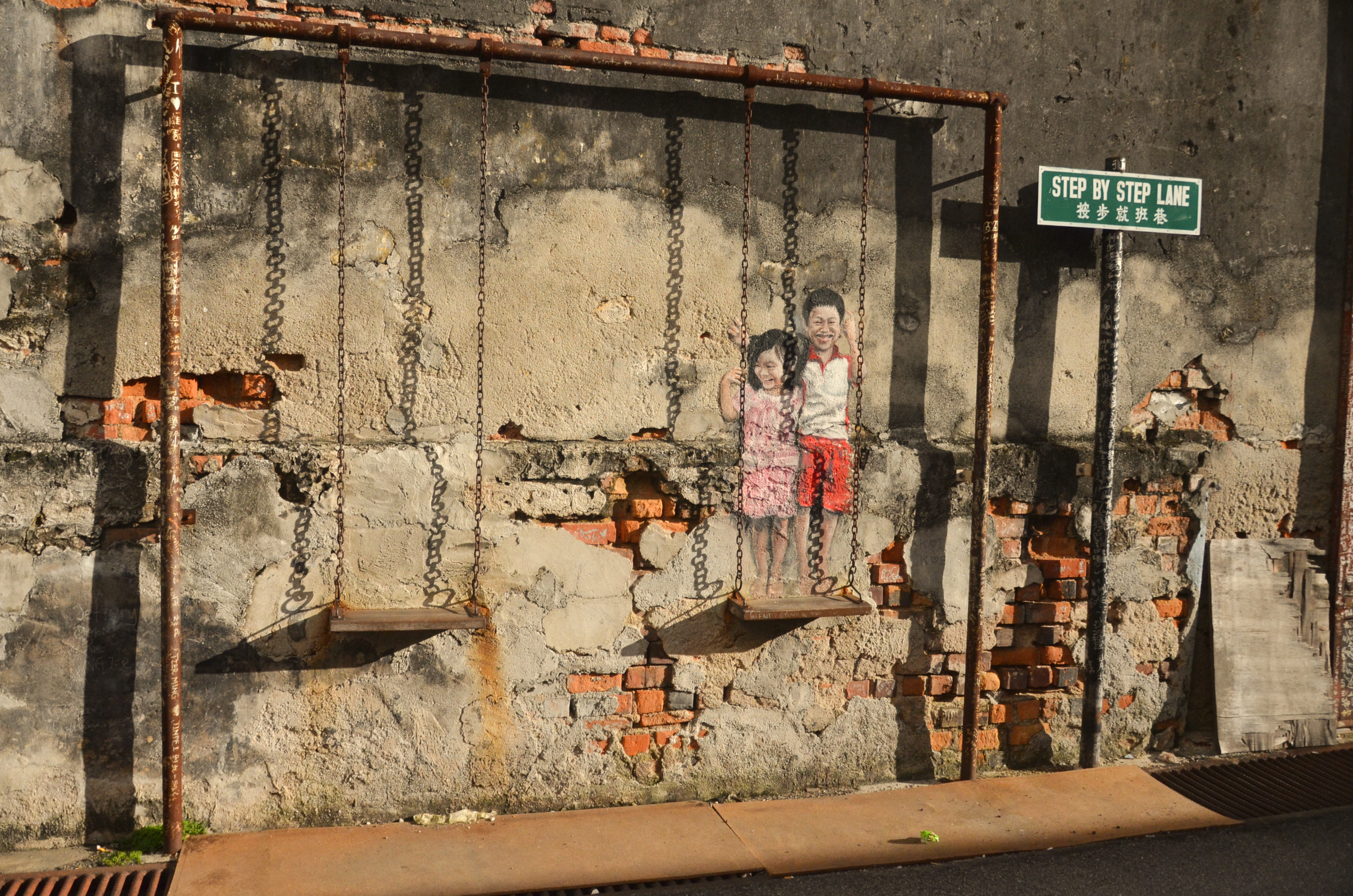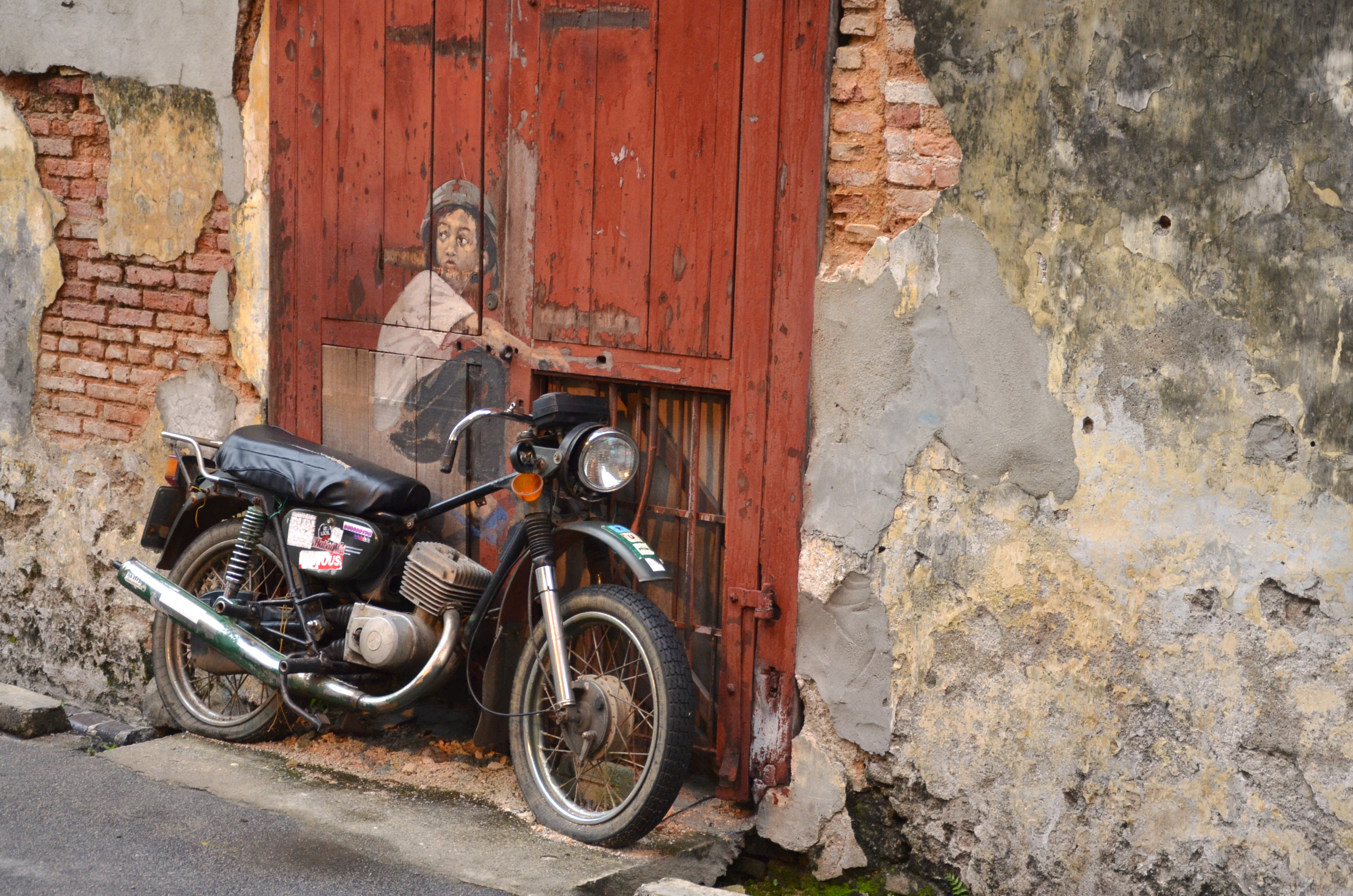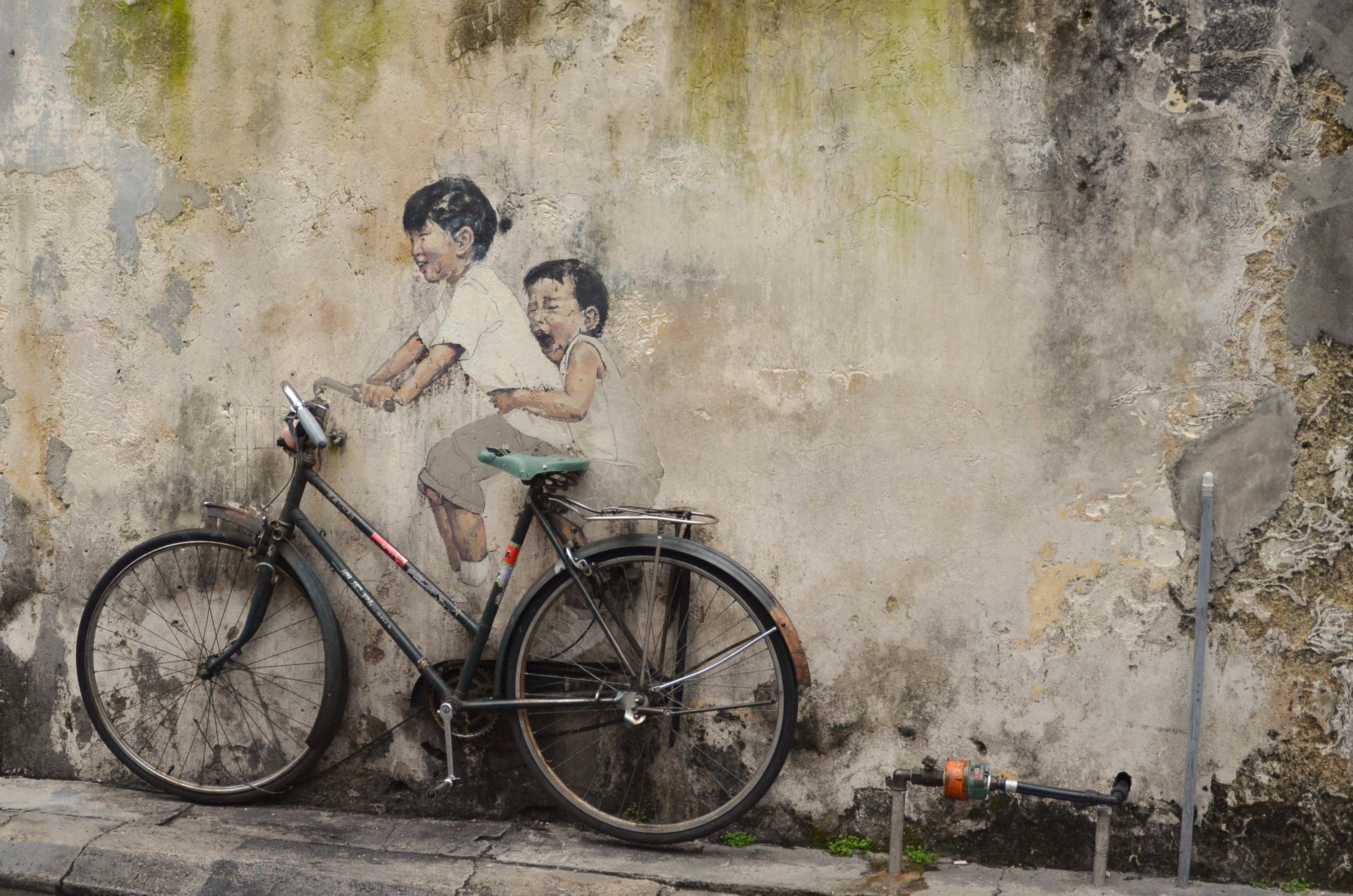 Penang did something wonderful in my opinion: they welcomed artists who wanted to turn the city into their canvas! This resulted in very interesting paintings popping up out of nowhere on derelict walls – adding to the charm of a historic city. One does not get the sterile feeling of artificiality like Singapore’s ‘preservation’ or ‘artistic’ endeavors. In Penang, art, culture and history flows naturally. Going around Georgetown with a friend, and subsequently on bikes, we ‘hunted’ for these street corner art that made the place so interesting. Besides paintings, there are also steel sculptures that tell the story of the city, but I prefer paintings! So here goes: