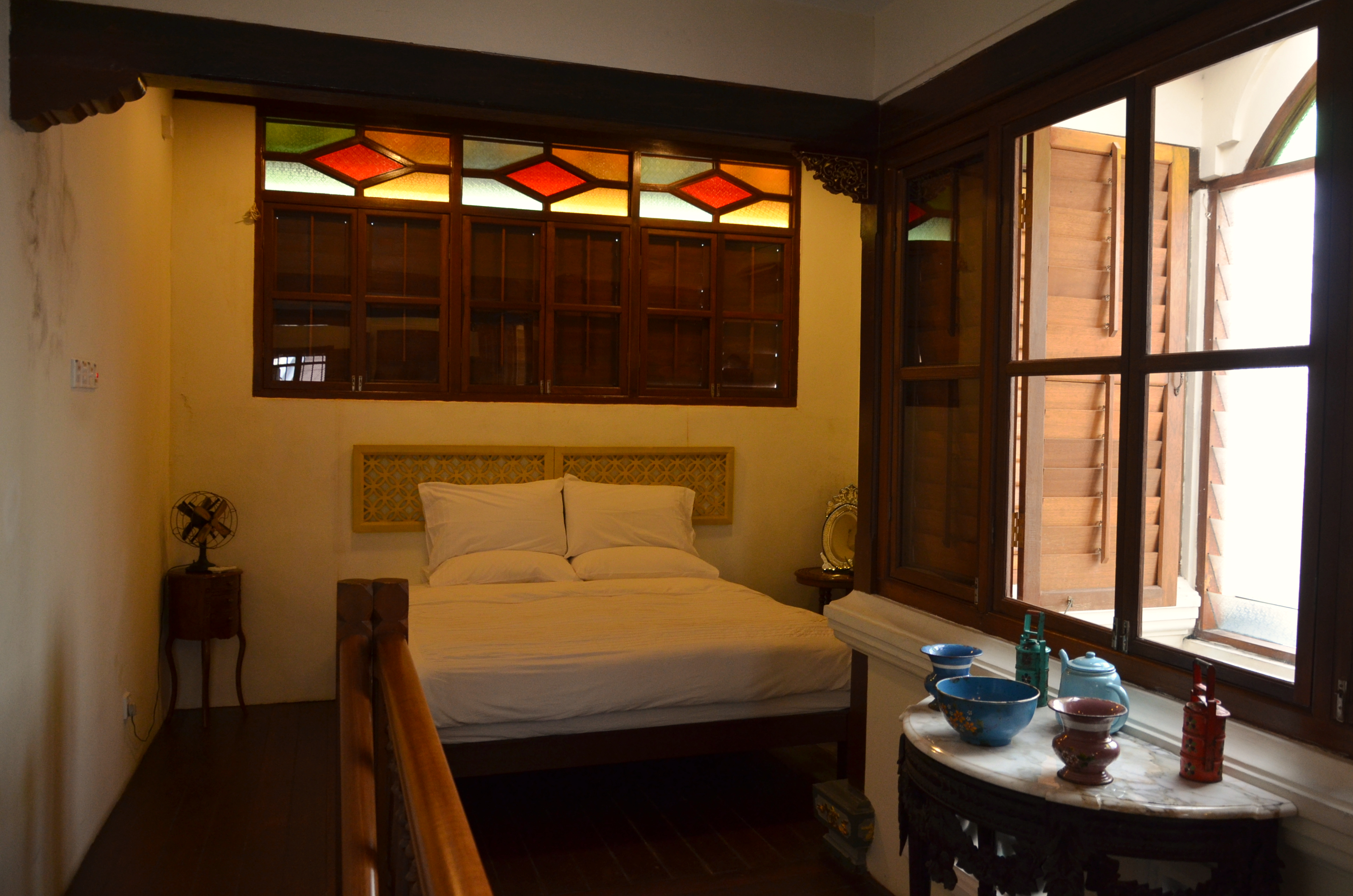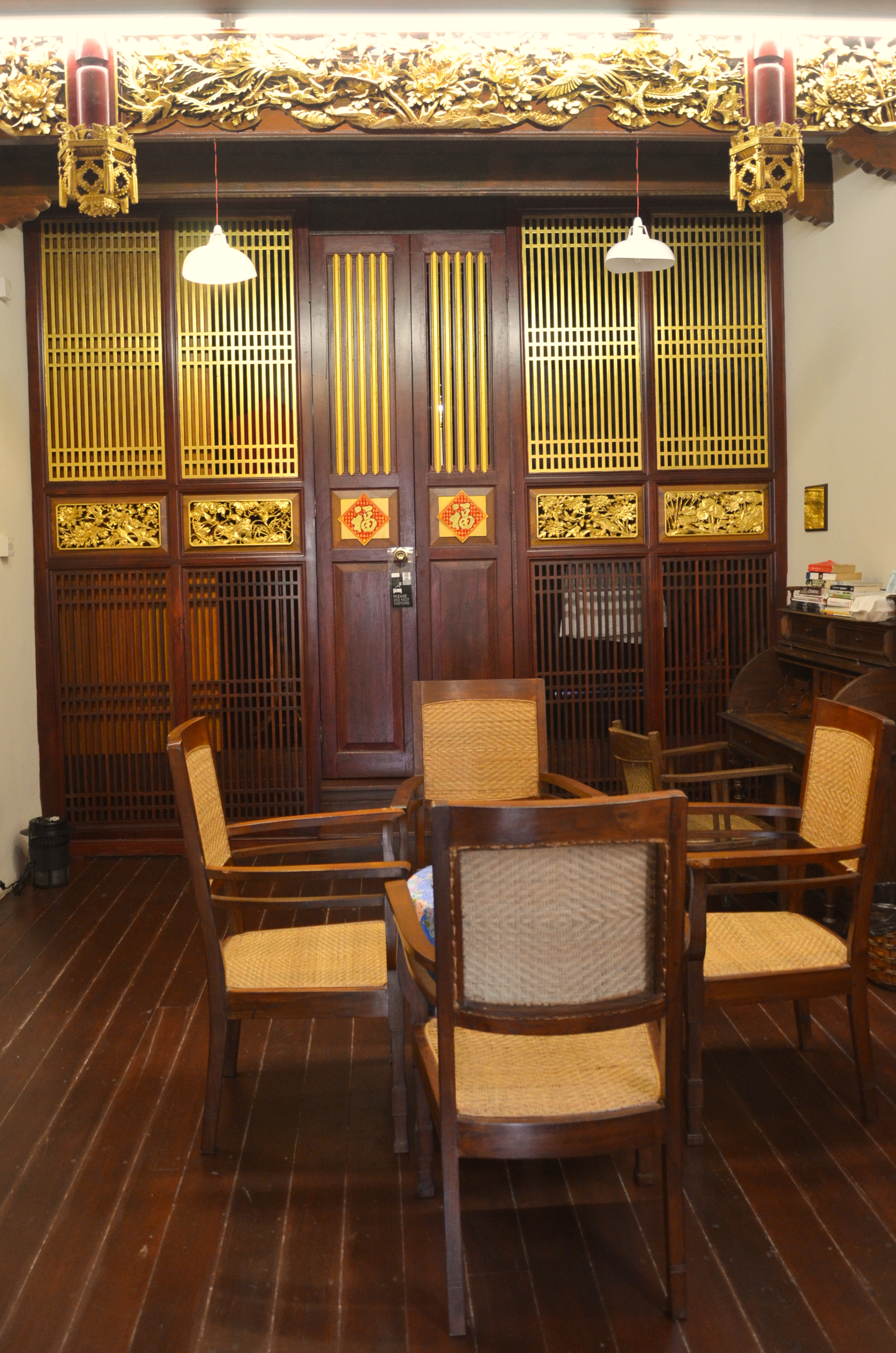 For us, we chose 2 nights in a really nice restored shop house called the Straits Heritage@92 Armenian Street. Right in the heart of Georgetown. Just a few doors away is the historical building where Sun Yat Sen plotted the 1911 Chinese revolution. Just the carved, gold leave doors of authentic Chinese, turn-of-the-century designed cost RM 20 000.00 to replicate. Imagine the detail and care put into the place by the owners to give their guest a real historical treat! The house has 3 stories, with suites on the 2nd and 3rd floor. You can choose either. We took the suite on the 3rd floor, but as there were no occupants on the 2nd, we had the whole house to ourselves.